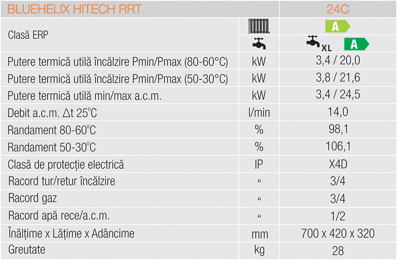 BLUEHELIX HITECH RRT sunt centrale termice murale în condensare cu panou de comandă digital, pentru încãlzire și preparare apă caldă menajeră, cu funcționare pe gaze naturale sau GPL fără a fi necesară schimbarea duzelor, cu randamente foarte ridicate și emisii de noxe deosebit de reduse.